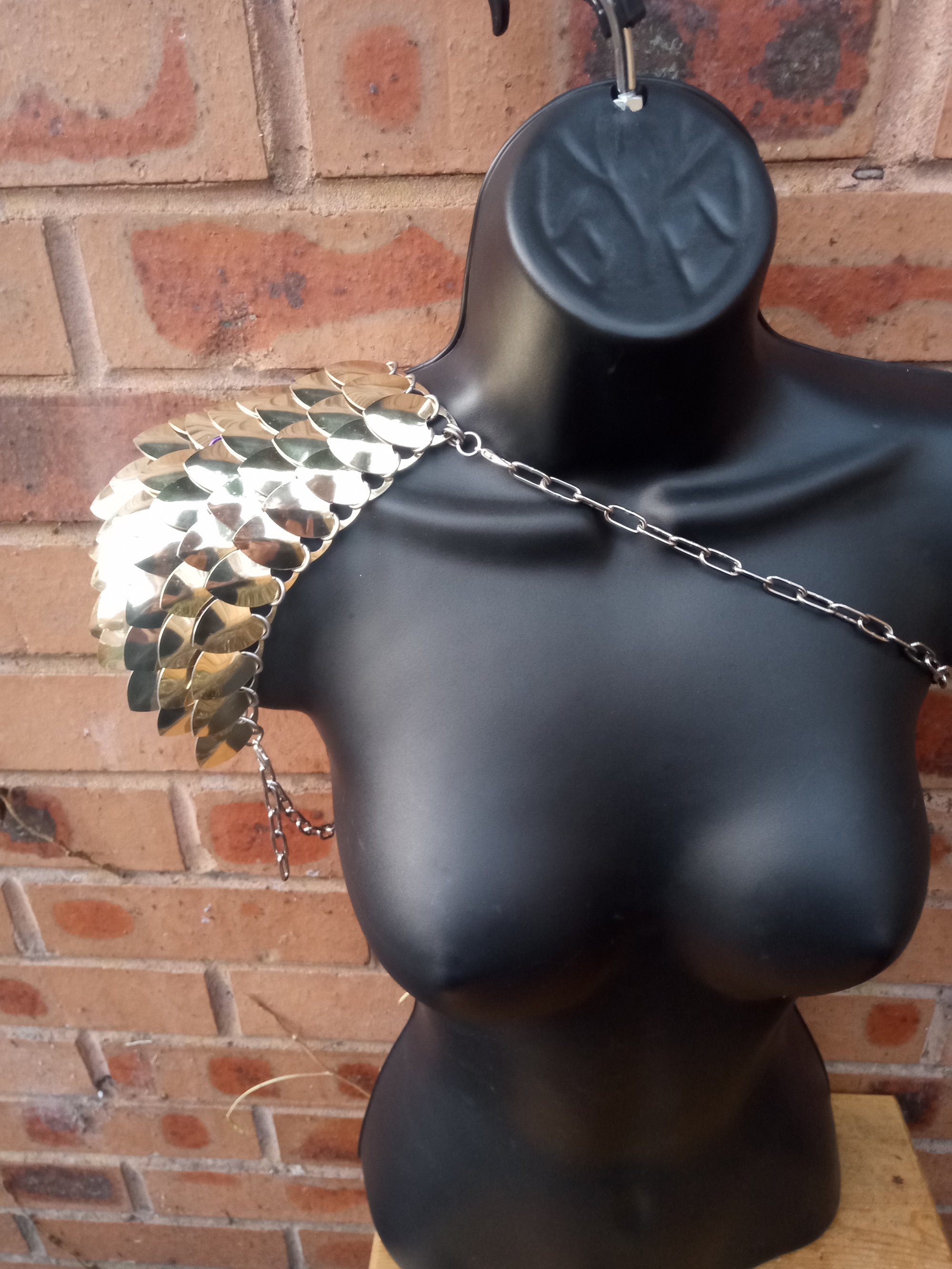 Gorgeous scalemail pauldron, created from mirror gold anodised aluminum scales and aluminium and stainless steel rings. Adjustable underarm and cross-body chain straps designed for your comfort. Dazzle the crowds in this one shoulder piece!